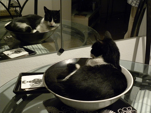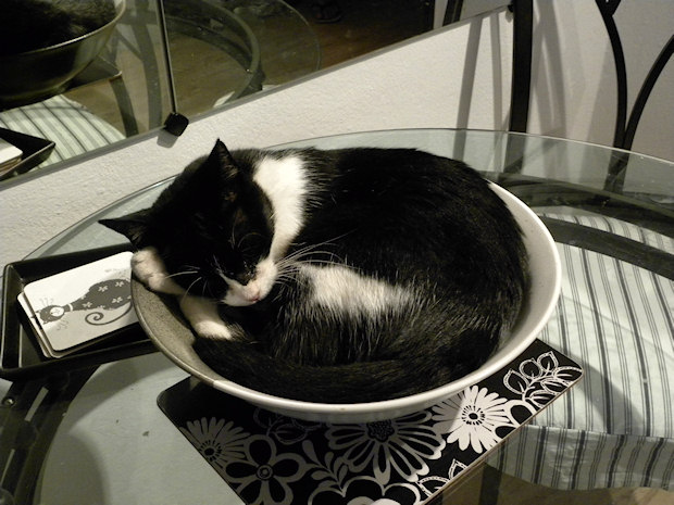 Felix (my neighbour´s cat) sleeping in a fruit bowl.  Perfectly sized for him of course.  And check out the colour co-ordination all around him to go with his black and white fur! Purrfect.  ;D