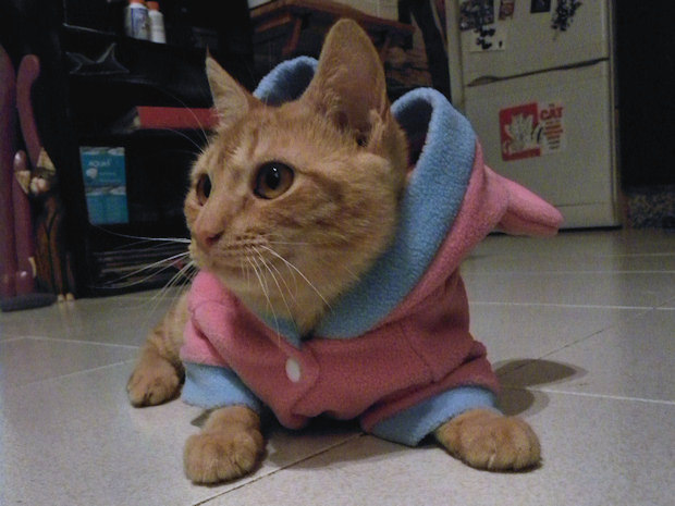 Here´s Ruby, who is actually too small for it (she´s only 5 months!), modelling this cute little kitty/doggie jacket. 🙂