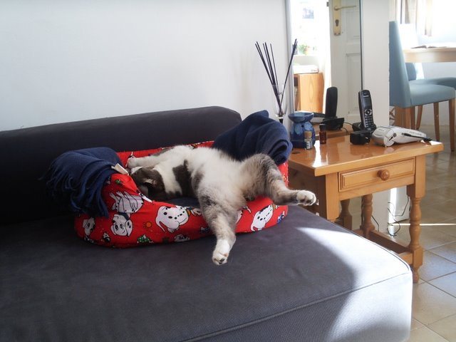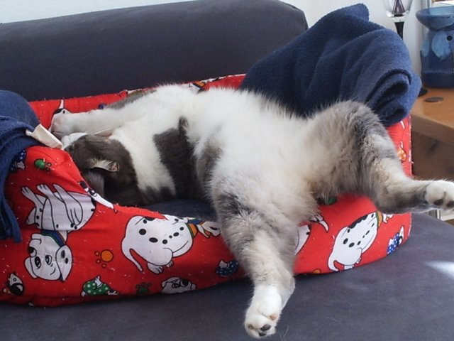 Squeaky, one of my friend Anneke´s kitties (where Janelle lives now), showing us all how to relax is done!