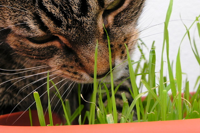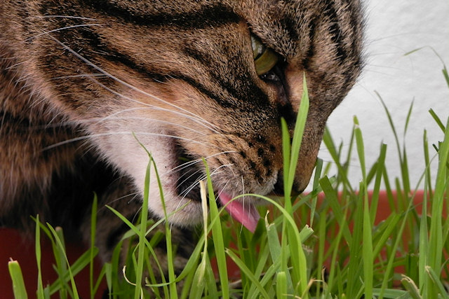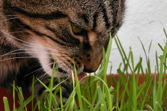 Spider enjoys munching the grass I planted in a small pot, specially for the kitties.
