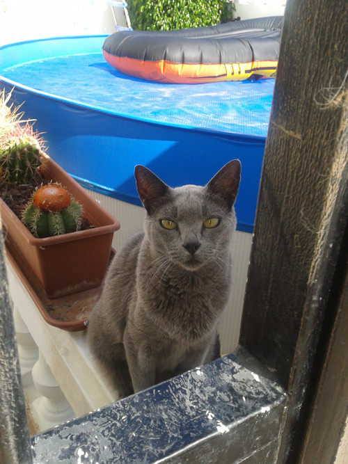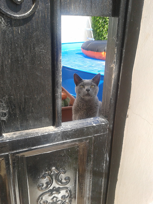 “Ah, finally you can marvel at my stunning grey beauty close up…” meows Corky from next door.