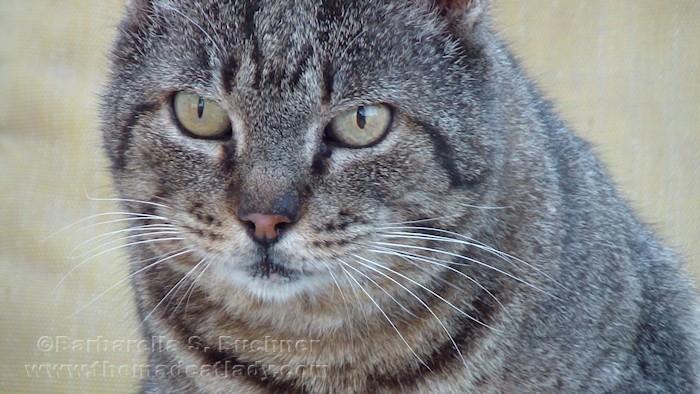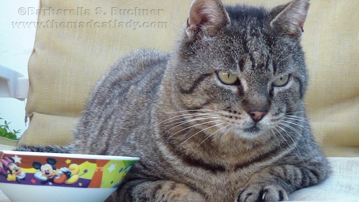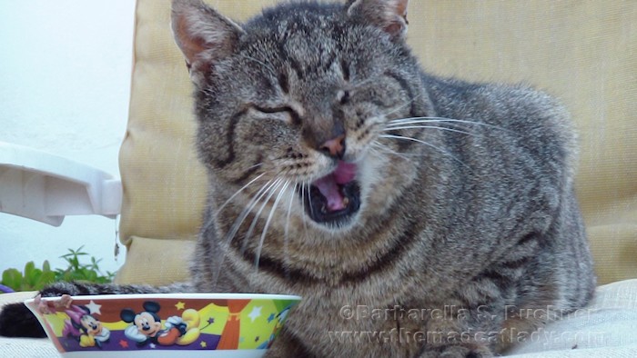 Tommy is a huge, tattered old stray tom that lives in my friend Anneke´s garden.  He simply appeared from out of nowhere one day and decided to “move in”.  He is not allowed in the house, but seems to be quite at home on the recliner on the patio.  Here he is munching leftovers that the other cats didn´t eat from the evening before….