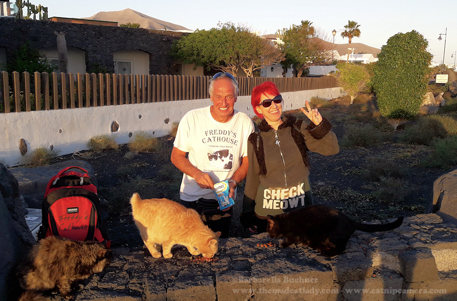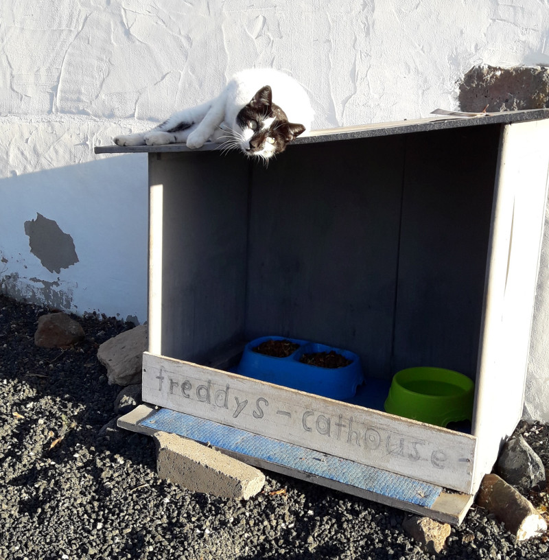 I recently met up to do an interview with Freddy of Freddy’s Cathouse in Playa Blanca, a town in the west of our island of Lanzarote. Him and his charity are totally dedicated to helping improve the lives of approx. 130-140 feral cats, with 26 feeding stations under his care.